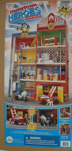 Assembled dimensions: 37.3" H x 27" L x 9.9" W, Model: 63265 Manufacturer's advised age: three & up, Made of composite wooden products Firefighter, police officer and two dogs which you can bend and pose, 16 pieces of furniture, Gliding elevator and a molded plastic staircase, Firefighter's pole for sliding from the top ground to the bottom 4 floors and 8 rooms of open area for enjoyable, creative play, three rescue automobiles - hearth truck, motorcycle and helicopter, Motorcycle and fireplace truck make reasonable sounds and have headlights that gentle up! Garage space with doorways that open and shut, Wide windows let kids look in and spot from totally different points of view, Large sufficient that multiple children can play at once